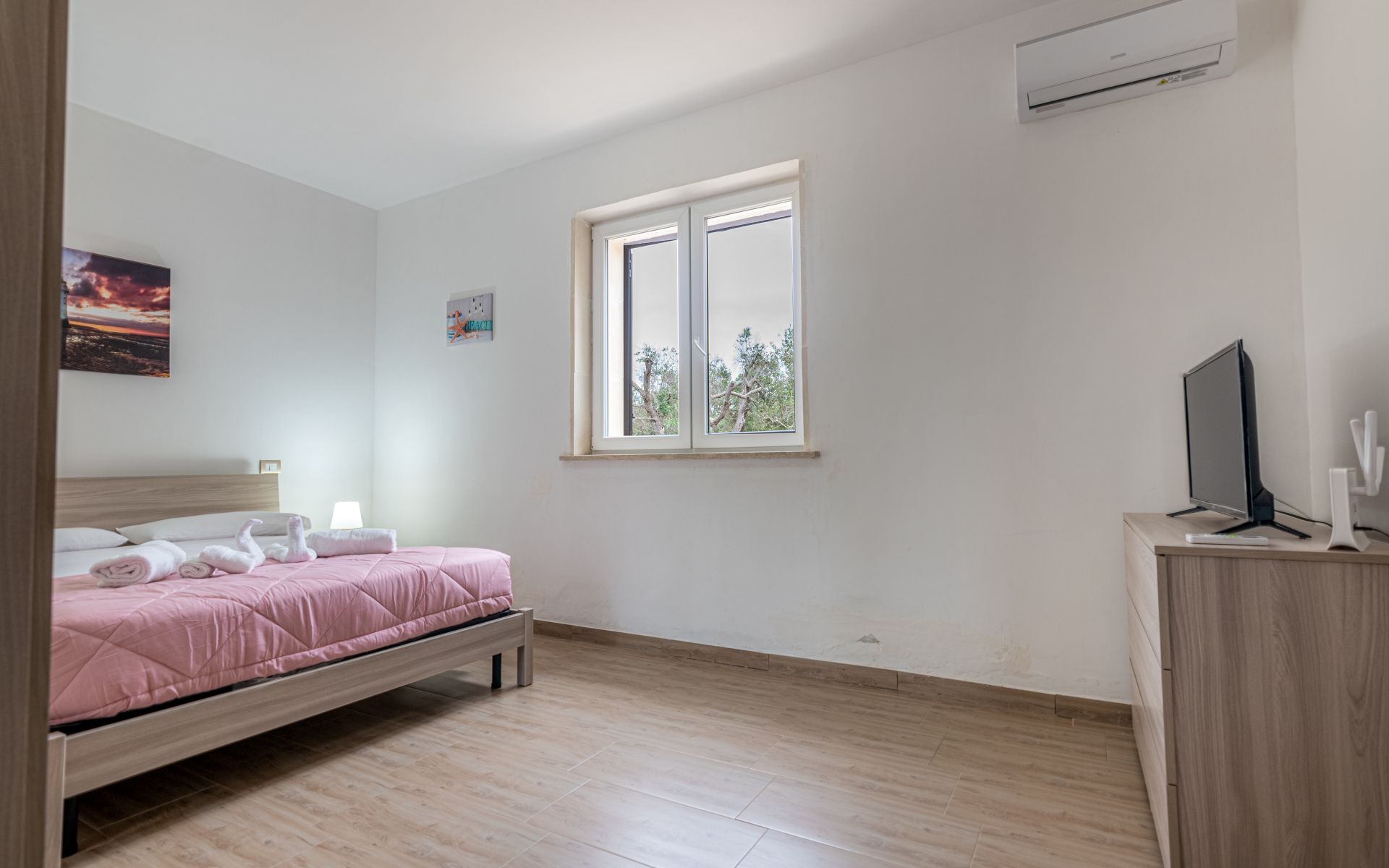 La prima camera è arredata con un letto matrimoniale e un letto singolo, offrendo una soluzione spaziosa e confortevole per i genitori con un bambino.