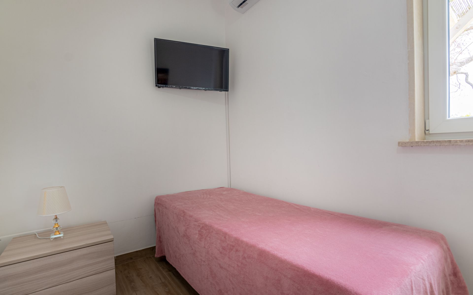 Il letto singolo, altrettanto comodo, è ideale per un bambino o un adulto, offrendo un’opzione flessibile per diverse configurazioni di ospiti.